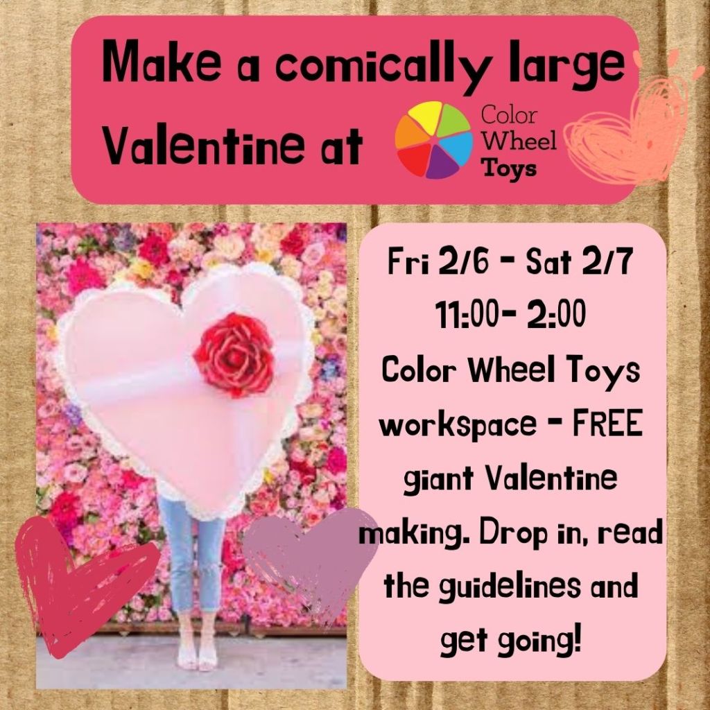 Fri Feb 6 – Sat Feb 7 from 11 am – 2 pm: Free Giant DIY Valentine making in our workspace – decorate a huge cardboard heart with fancy supplies for someone you love! Best for ages 3+. Drop in, read the guidelines, and get working on your cool project. 🙂
