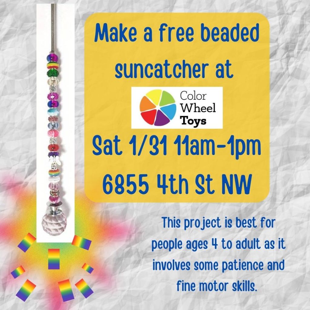 January 31st 11 am – 1 pm: Bead a crystal suncatcher! This free project is best for people ages 4 – adult, as it involves stringing tiny beads for awhile to get the finished result! We will even provide a suction cup so you can hang it in a sunny window and immediately reap the rewards of your labor. Plan on about 15 minutes to make your project.