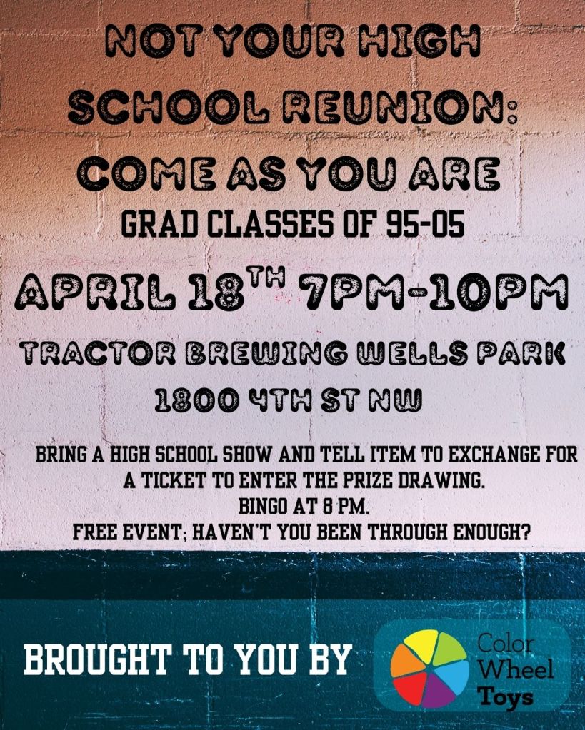 A night for remembering the funny, the weird, the messed up and the past version of you. Crafting, a photo booth, wall of nostalgia, a retro raffle (bring random high school memorabilia to show & tell to get a ticket), a DJ, airing of resentments, superlatives, bingo (8 pm) & more. Free; tell your homies.