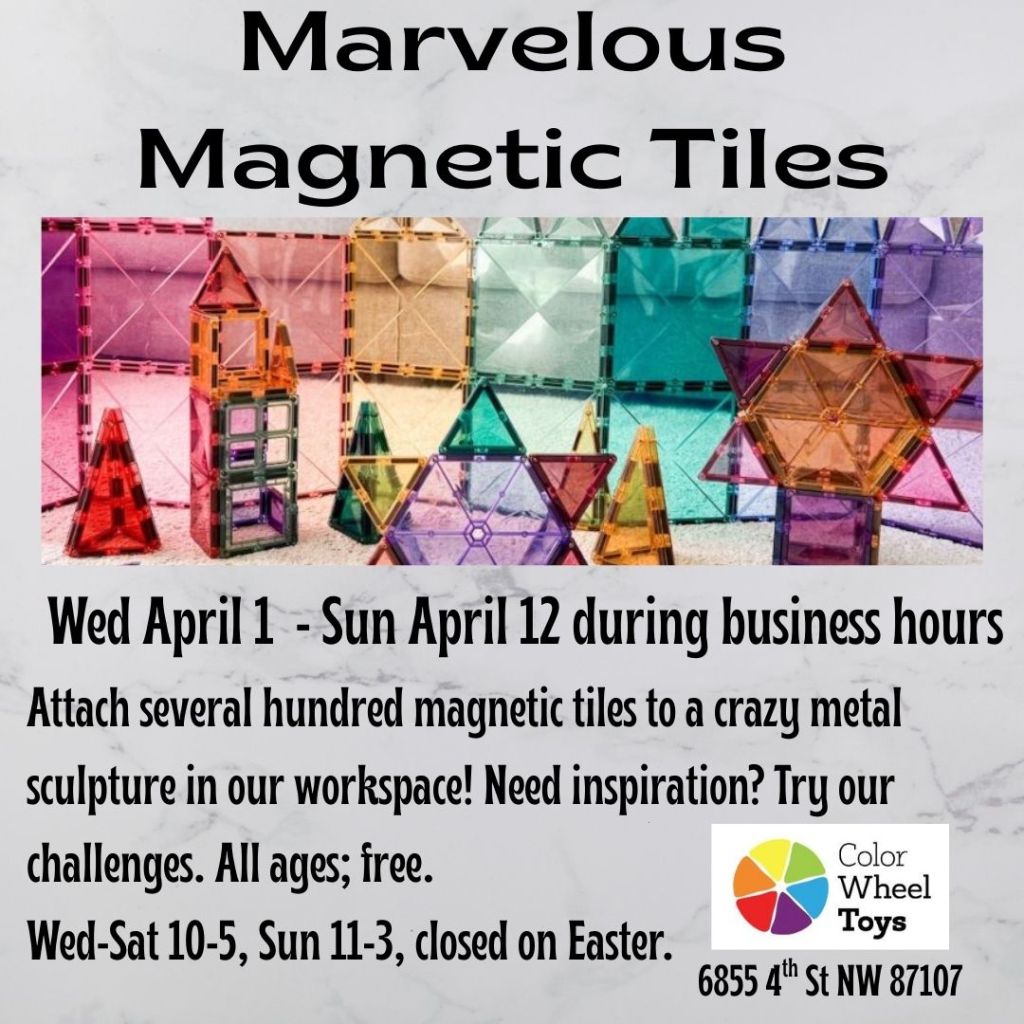 Wed 3/19 – Sat 3/22 10 am – 4 pm: make THE MOST BEAUTIFUL THING, free by appointment. This three dimensional art project is for people ages 4 to adult – make a ½ hour reservation by texting 505-999-7489 or emailing colorwheeltoysabq@gmail.com . You will be using a low temp hot glue gun to add to your sculpture, so people under the age of 12 need a guardian with them in the workspace while they work.