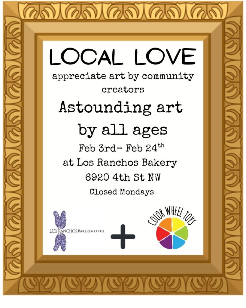 Tues Feb 3rd – Tues Feb 24th: Local Love All Ages Art Show by community creators! This event is at Los Ranchos Bakery, put on by Color Wheel Toys.