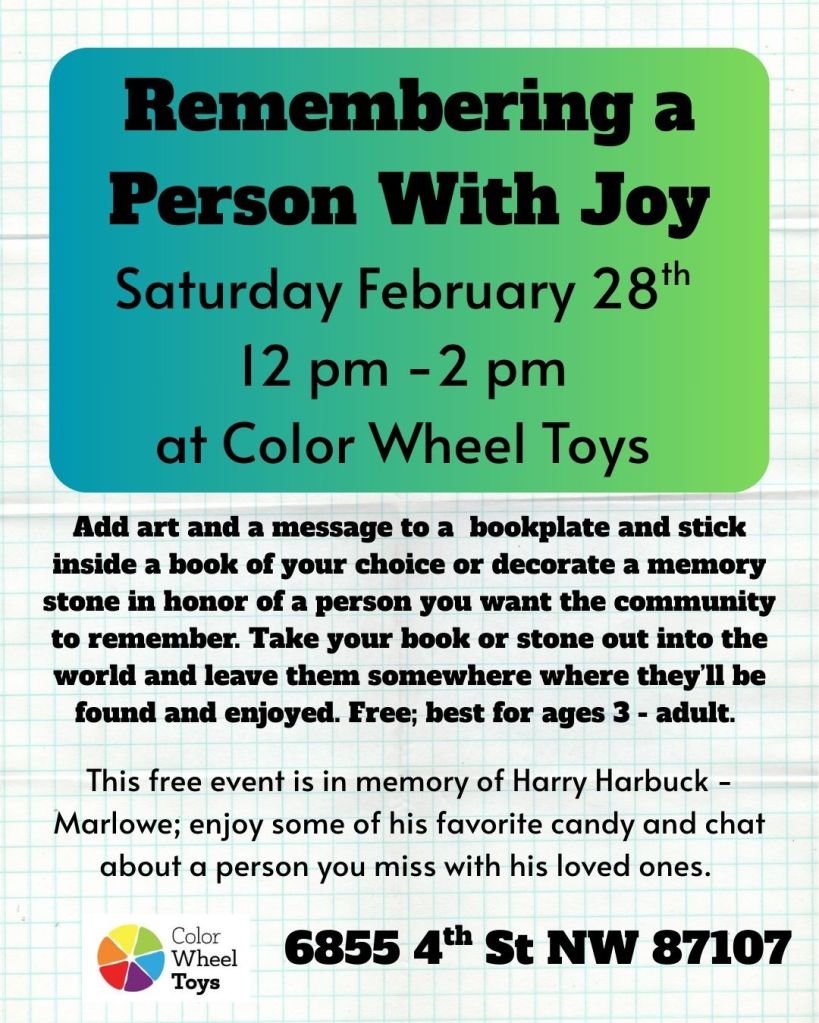 Saturday Feb 28th 12 pm- 2 pm: Remembering a Person With Joy.